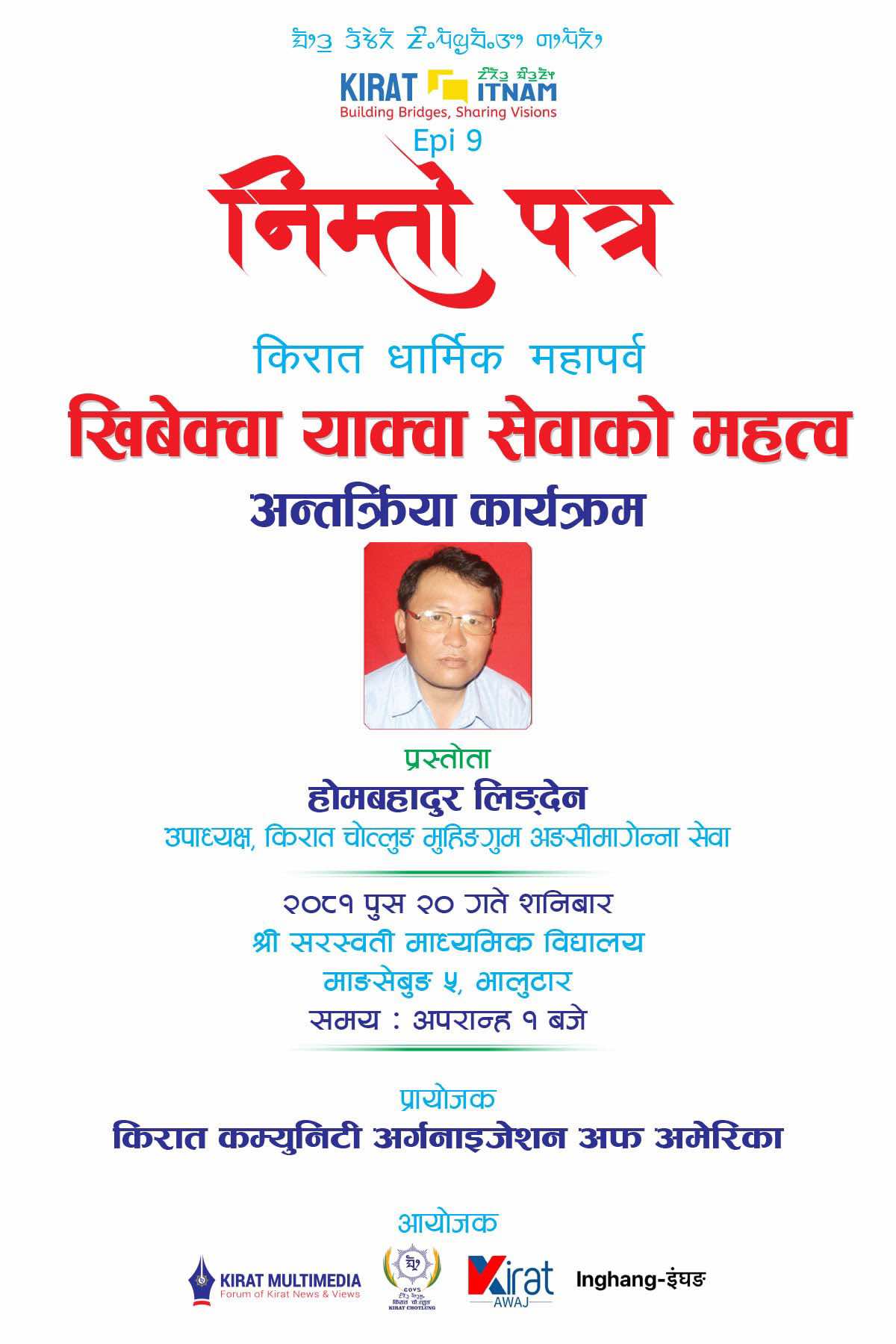 माङसेबुङ । किरात इत्नामको ९ औ श्रृंखला कार्यक्रम भोली शनिबार माङसेबुङ ५ भालुटारमा हुने भएको छ । किरात चोत्लुङ मुहिङगुम अङसीमाङगेन्ना सेवा समितिका उपाध्यक्ष होम बहादुर लिङदेनद्धारा प्रस्तुत किरात धार्मिक महापर्व खिबेक्वा याक्वा सेवाको महत्वबारेमा अन्तक्रिया कार्यक्रम हुने भएको हो । यसैगरि इत्नामको ९ औ श्रृंखला कार्यक्रमको किरात कम्युनिटि अर्गनाइजेशन अफ अमेरिकाले प्रायोजन गरेको छ […]