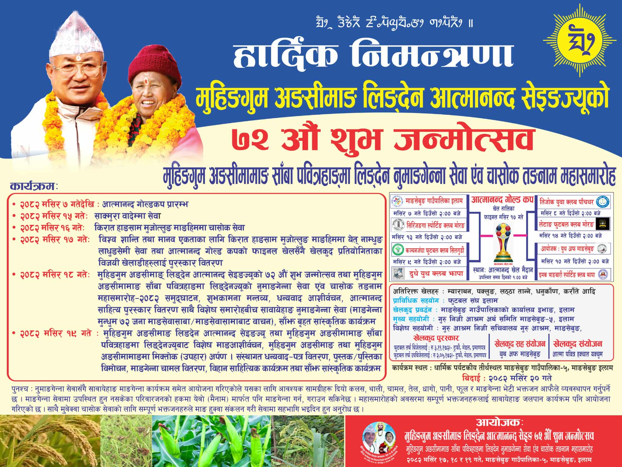 विश्व शान्ति र मानव एकताका निम्ति फुटबल भन्ने नाराका साथ मुहिङगुम अङसीमाङ लिङदेन आत्मानन्द ‘सेइङ’ ७२औं जन्मोत्सव तथा मुहिङगुम अङसीमामाङ साँबा पवित्रहाङमा लिङदेन नुमाङगेन्ना सेवा महासमारोह २०८२ को अवसरमा आयोजित प्रतियोगिताको फाइनल खेल मंसिर १७ गते हुनेछ ।